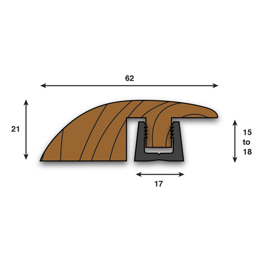 Solid hardwood ramp profile, specifically designed for joining two floors unequal height. The full ramp will remove a difference in floor height of approximately 15mm. Height adjustable for floors between 15 & 18mm in finished thickness.